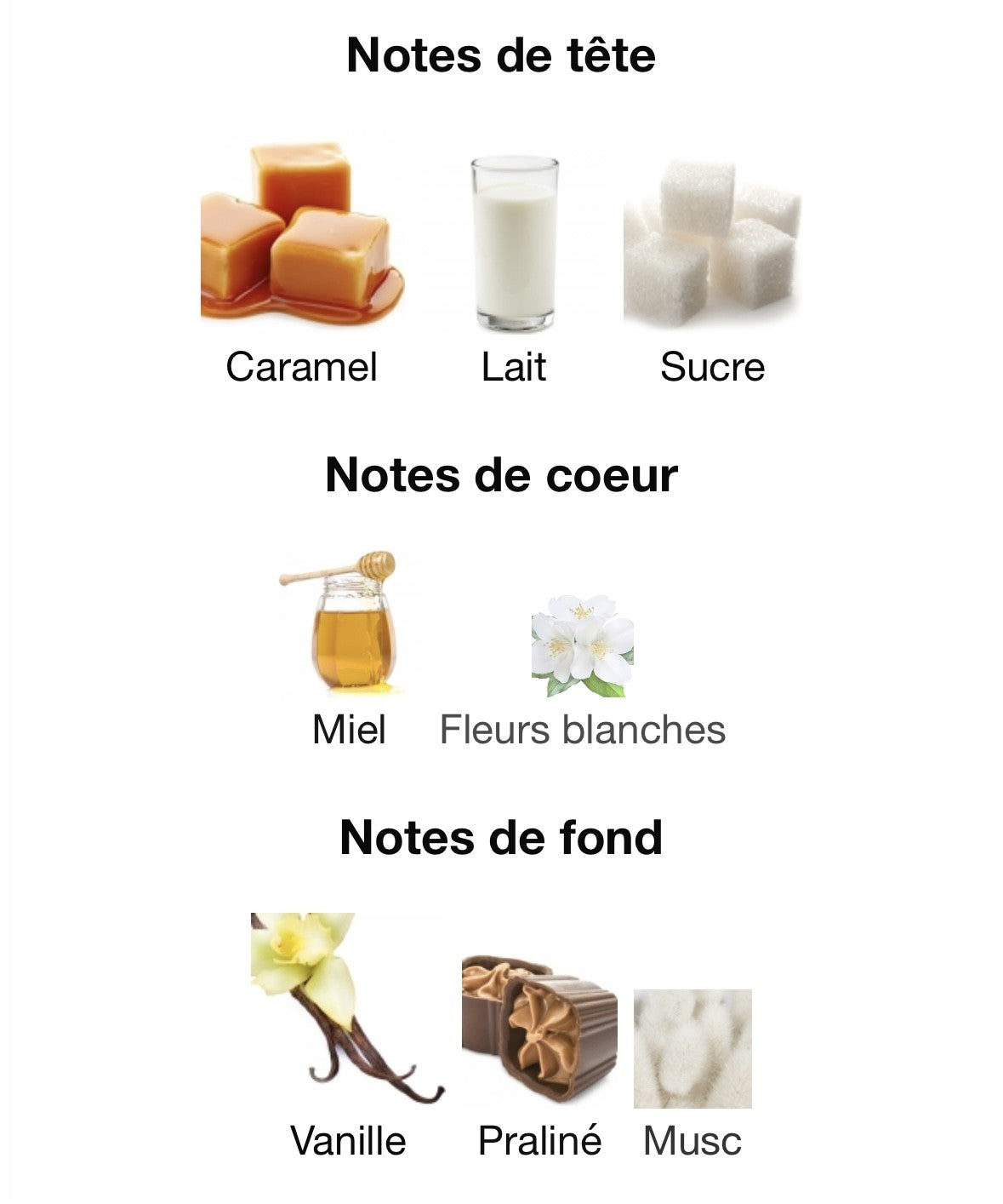- Notes de tête : Sucre, Caramel, Lait